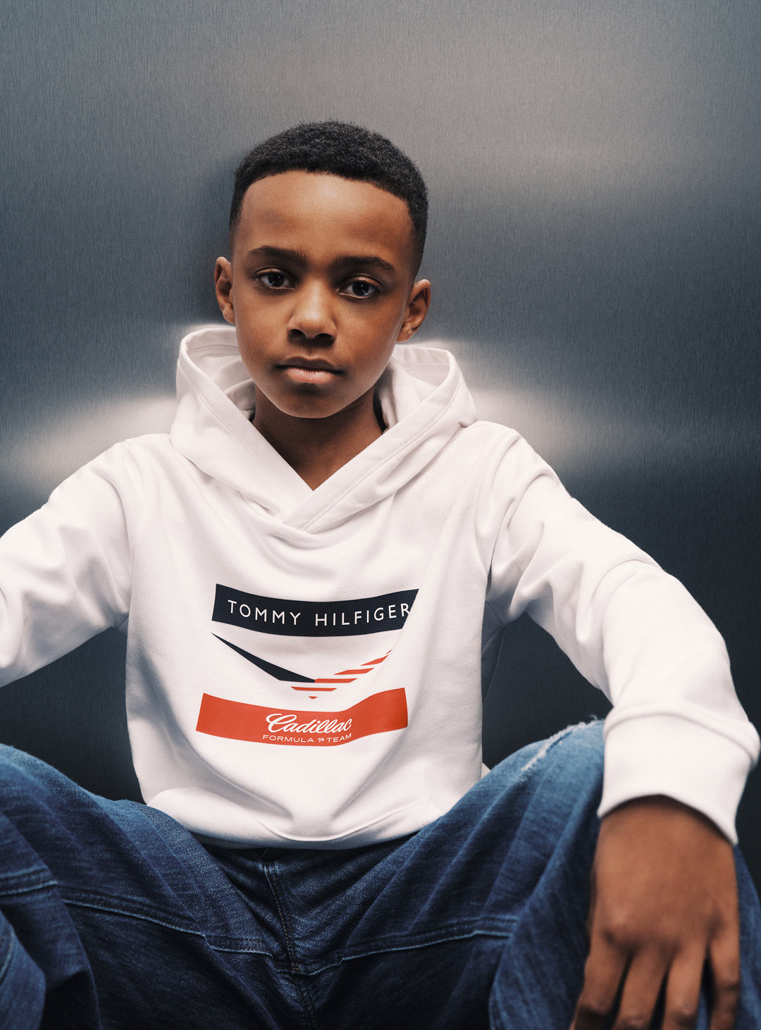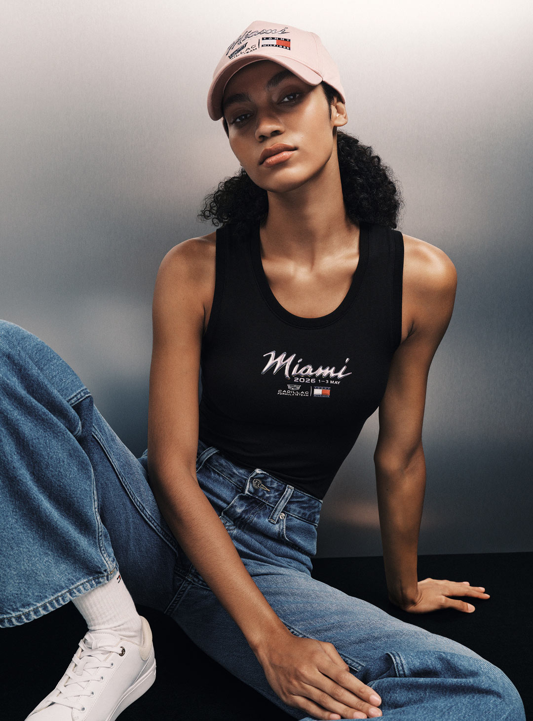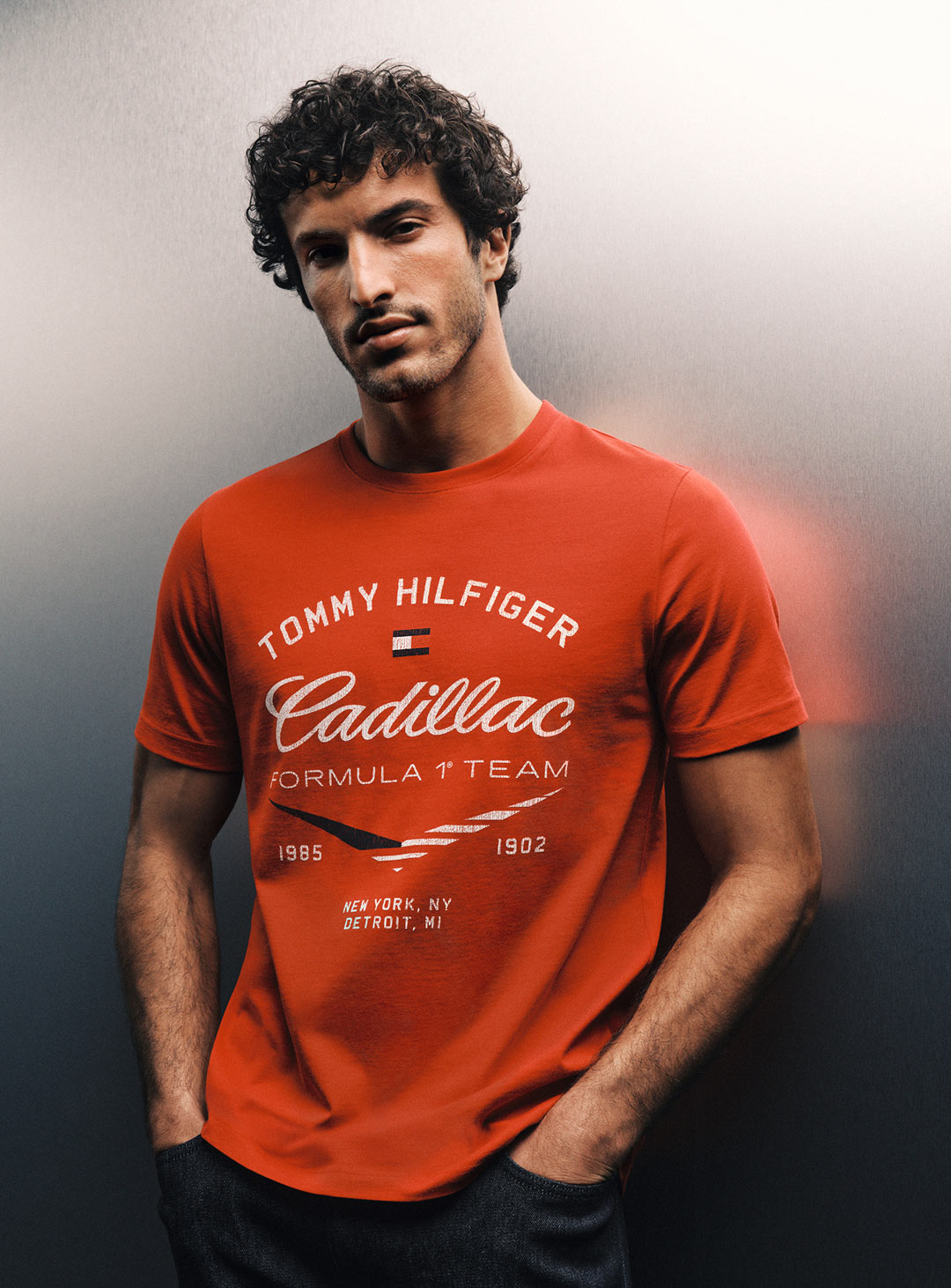 Zhou Guanyu wearing Tommy Hilfiger x Cadillac clothing.
