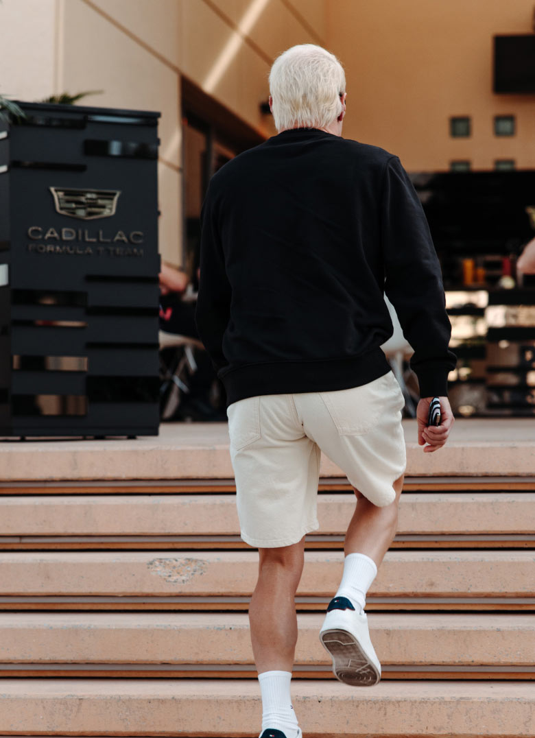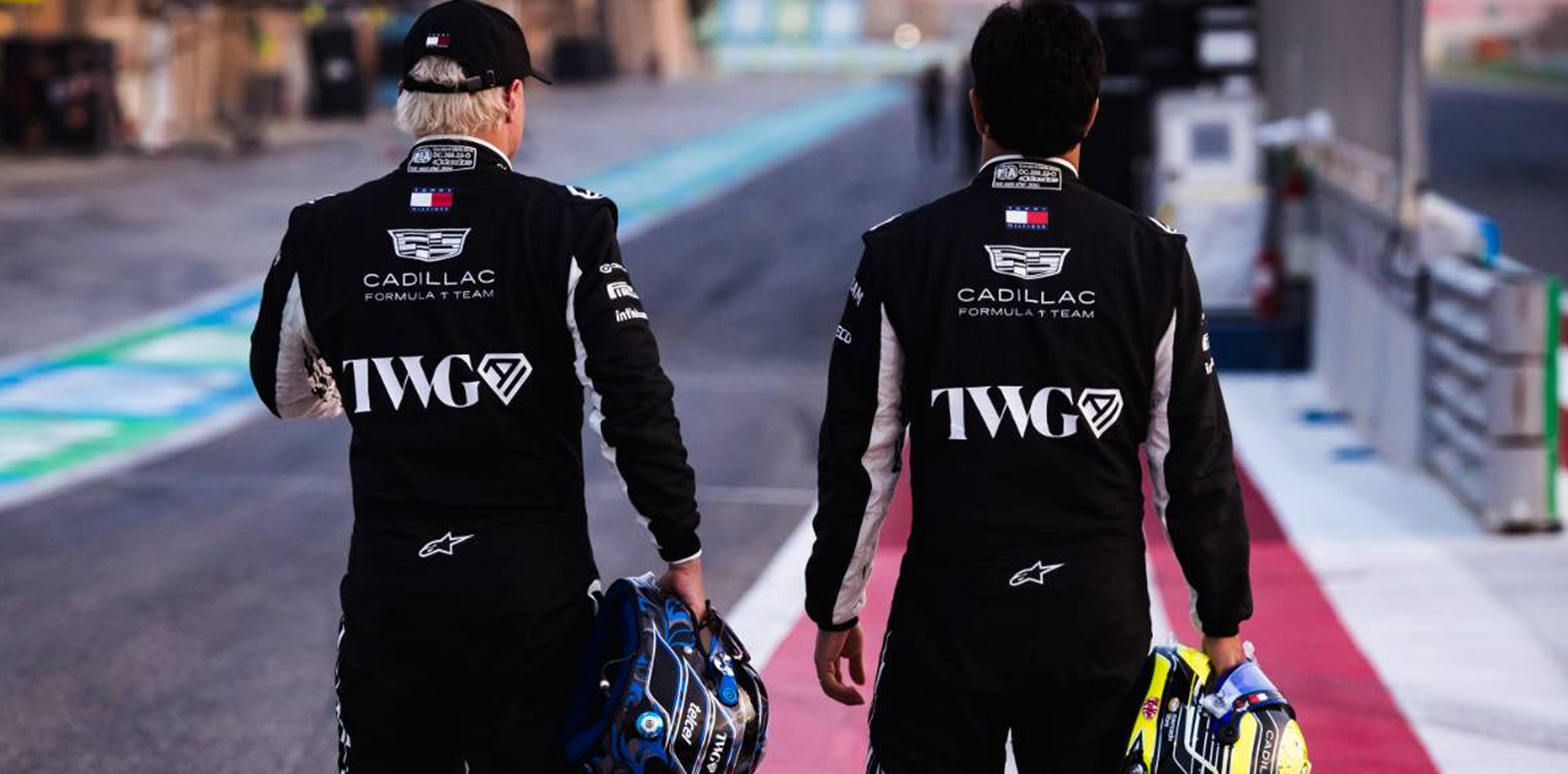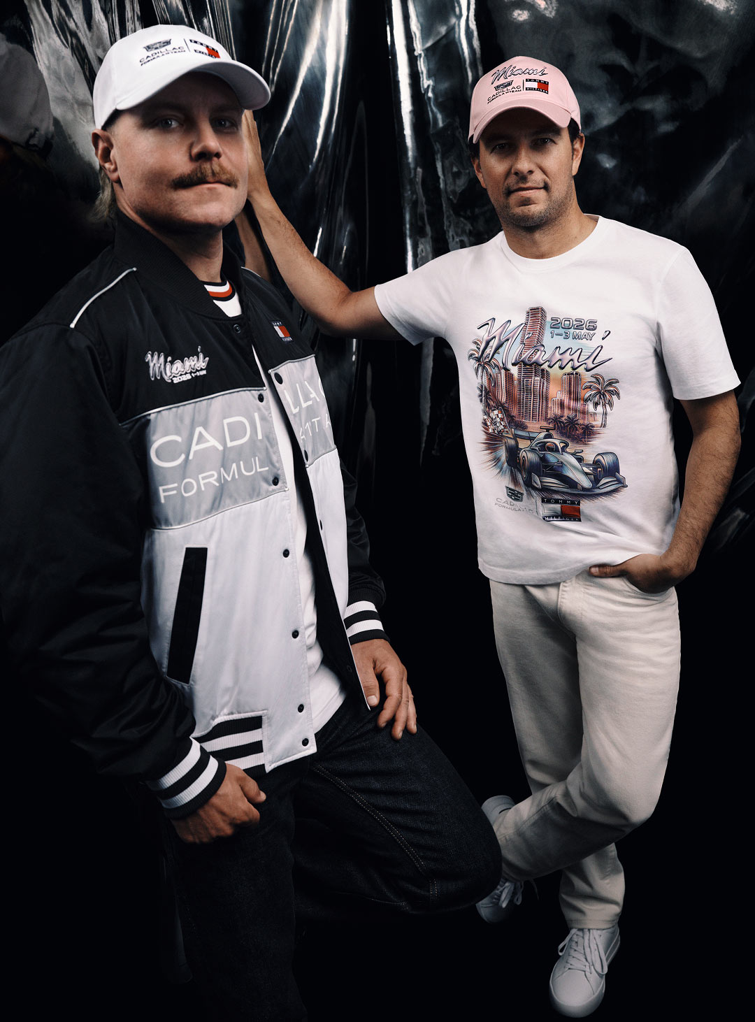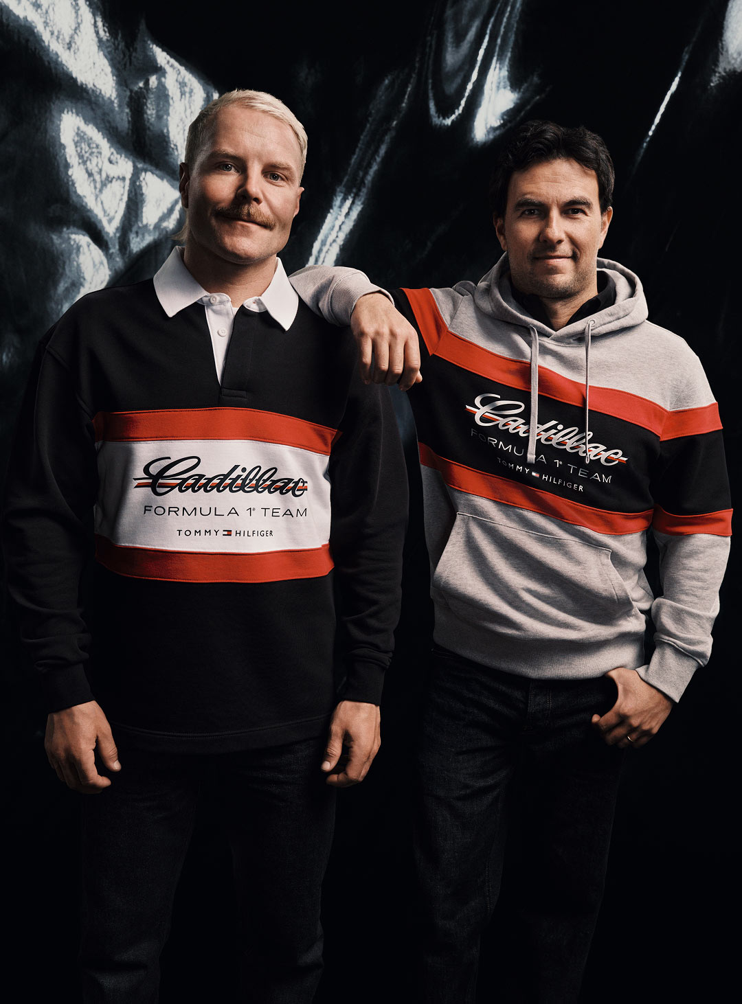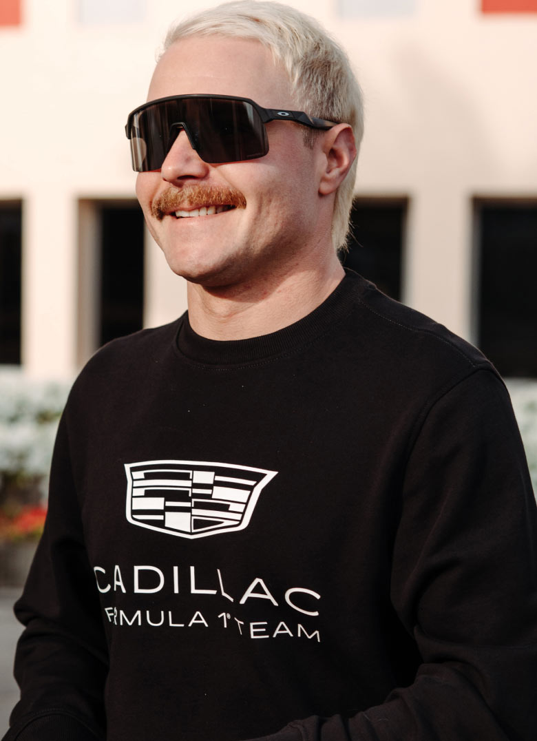 Valtteri Bottas wearing Tommy Hilfiger x Cadillac clothing.
