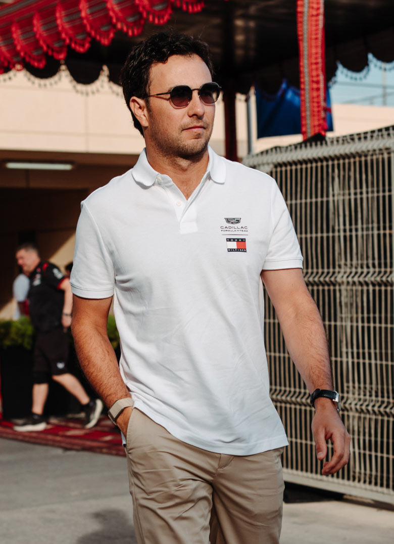 Checo Pérez wearing Tommy Hilfiger x Cadillac clothing.